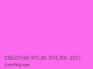 CIELCh 66.971,81.574,331.221 Color is a light magenta color and the nearest color is Pink Flamingo Crayola #ff66ff. Hex code #fc68eb and RGB value is rgb(252,104,235). In RGB color space, this color is composed of 99% red, 41% green, 92% blue, In CMYK color space, this color is composed of 0% cyan, 59% magenta, 7% yellow , 1% black , In HSL color space, this color has a hue angle of 307° , 96% saturation and 70% lightness.