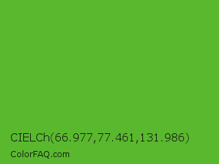 CIELCh 66.977,77.461,131.986 Color is a normal green color and the nearest color is Green RYB #66b032. Hex code #59b82e and RGB value is rgb(89,184,46). In RGB color space, this color is composed of 35% red, 72% green, 18% blue, In CMYK color space, this color is composed of 52% cyan, 0% magenta, 75% yellow , 28% black , In HSL color space, this color has a hue angle of 101° , 60% saturation and 45% lightness.