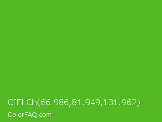 CIELCh 66.986,81.949,131.962 Color is a normal green color and the nearest color is Kelly Green #4cbb17. Hex code #52b923 and RGB value is rgb(82,185,35). In RGB color space, this color is composed of 32% red, 73% green, 14% blue, In CMYK color space, this color is composed of 56% cyan, 0% magenta, 81% yellow , 27% black , In HSL color space, this color has a hue angle of 101° , 68% saturation and 43% lightness.