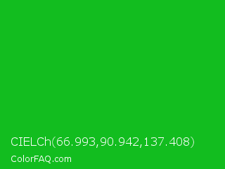 CIELCh 66.993,90.942,137.408 Color is a normal green color and the nearest color is Vivid Malachite #00cc33. Hex code #12bd1f and RGB value is rgb(18,189,31). In RGB color space, this color is composed of 7% red, 74% green, 12% blue, In CMYK color space, this color is composed of 90% cyan, 0% magenta, 84% yellow , 26% black , In HSL color space, this color has a hue angle of 125° , 83% saturation and 41% lightness.