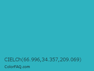 CIELCh 66.996,34.357,209.069 Color is a normal cyan color and the nearest color is Maximum Blue Green #30bfbf. Hex code #2eb3c0 and RGB value is rgb(46,179,192). In RGB color space, this color is composed of 18% red, 70% green, 75% blue, In CMYK color space, this color is composed of 76% cyan, 7% magenta, 0% yellow , 25% black , In HSL color space, this color has a hue angle of 185° , 61% saturation and 47% lightness.