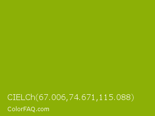 CIELCh 67.006,74.671,115.088 Color is a normal lime color and the nearest color is Apple Green #8db600. Hex code #8cb006 and RGB value is rgb(140,176,6). In RGB color space, this color is composed of 55% red, 69% green, 2% blue, In CMYK color space, this color is composed of 20% cyan, 0% magenta, 97% yellow , 31% black , In HSL color space, this color has a hue angle of 73° , 93% saturation and 36% lightness.