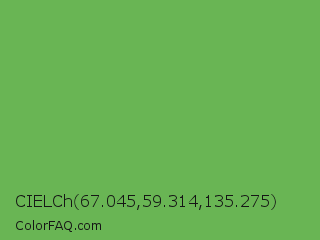 CIELCh 67.045,59.314,135.275 Color is a normal green color and the nearest color is Bud Green #7bb661. Hex code #69b554 and RGB value is rgb(105,181,84). In RGB color space, this color is composed of 41% red, 71% green, 33% blue, In CMYK color space, this color is composed of 42% cyan, 0% magenta, 54% yellow , 29% black , In HSL color space, this color has a hue angle of 107° , 40% saturation and 52% lightness.