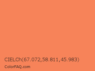 CIELCh 67.072,58.811,45.983 Color is a light orange color and the nearest color is Coral #ff7f50. Hex code #f78359 and RGB value is rgb(247,131,89). In RGB color space, this color is composed of 97% red, 51% green, 35% blue, In CMYK color space, this color is composed of 0% cyan, 47% magenta, 64% yellow , 3% black , In HSL color space, this color has a hue angle of 16° , 91% saturation and 66% lightness.