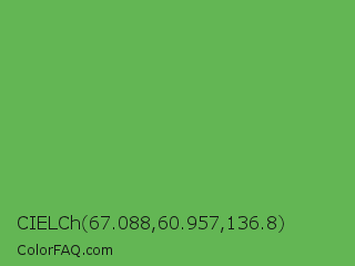 CIELCh 67.088,60.957,136.8 Color is a normal green color and the nearest color is Fern #63b76c. Hex code #63b654 and RGB value is rgb(99,182,84). In RGB color space, this color is composed of 39% red, 71% green, 33% blue, In CMYK color space, this color is composed of 46% cyan, 0% magenta, 54% yellow , 29% black , In HSL color space, this color has a hue angle of 111° , 40% saturation and 52% lightness.