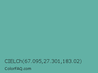 CIELCh 67.095,27.301,183.02 Color is a normal cyan color and the nearest color is Tradewind #5fb3ac. Hex code #62b1a5 and RGB value is rgb(98,177,165). In RGB color space, this color is composed of 38% red, 69% green, 65% blue, In CMYK color space, this color is composed of 45% cyan, 0% magenta, 7% yellow , 31% black , In HSL color space, this color has a hue angle of 171° , 34% saturation and 54% lightness.