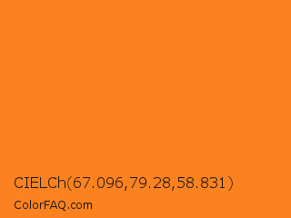 CIELCh 67.096,79.28,58.831 Color is a normal orange color and the nearest color is Princeton Orange #f58025. Hex code #fc821f and RGB value is rgb(252,130,31). In RGB color space, this color is composed of 99% red, 51% green, 12% blue, In CMYK color space, this color is composed of 0% cyan, 48% magenta, 88% yellow , 1% black , In HSL color space, this color has a hue angle of 27° , 97% saturation and 55% lightness.