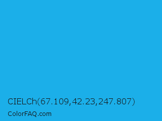 CIELCh 67.109,42.23,247.807 Color is a normal blue color and the nearest color is Button Blue #24a0ed. Hex code #1bafe9 and RGB value is rgb(27,175,233). In RGB color space, this color is composed of 11% red, 69% green, 91% blue, In CMYK color space, this color is composed of 88% cyan, 25% magenta, 0% yellow , 9% black , In HSL color space, this color has a hue angle of 197° , 82% saturation and 51% lightness.