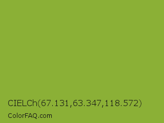 CIELCh 67.131,63.347,118.572 Color is a normal lime color and the nearest color is Sushi #87ab39. Hex code #8bb036 and RGB value is rgb(139,176,54). In RGB color space, this color is composed of 55% red, 69% green, 21% blue, In CMYK color space, this color is composed of 21% cyan, 0% magenta, 69% yellow , 31% black , In HSL color space, this color has a hue angle of 78° , 53% saturation and 45% lightness.