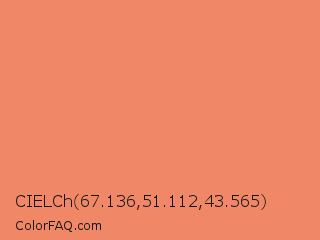 CIELCh 67.136,51.112,43.565 Color is a light red color and the nearest color is Big Foot Feet #e88e5a. Hex code #f08766 and RGB value is rgb(240,135,102). In RGB color space, this color is composed of 94% red, 53% green, 40% blue, In CMYK color space, this color is composed of 0% cyan, 44% magenta, 58% yellow , 6% black , In HSL color space, this color has a hue angle of 14° , 82% saturation and 67% lightness.