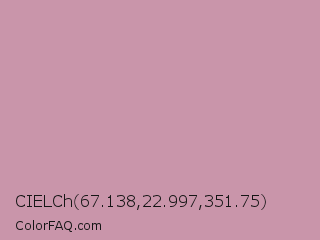 CIELCh 67.138,22.997,351.75 Color is a light rose color and the nearest color is Viola #cb8fa9. Hex code #c995aa and RGB value is rgb(201,149,170). In RGB color space, this color is composed of 79% red, 58% green, 67% blue, In CMYK color space, this color is composed of 0% cyan, 26% magenta, 15% yellow , 21% black , In HSL color space, this color has a hue angle of 336° , 33% saturation and 69% lightness.