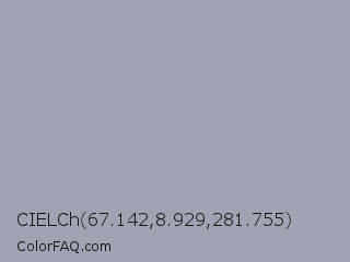 CIELCh 67.142,8.929,281.755 Color is a light blue color and the nearest color is Santas Gray #9fa0b1. Hex code #9fa3b3 and RGB value is rgb(159,163,179). In RGB color space, this color is composed of 62% red, 64% green, 70% blue, In CMYK color space, this color is composed of 11% cyan, 9% magenta, 0% yellow , 30% black , In HSL color space, this color has a hue angle of 228° , 12% saturation and 66% lightness.