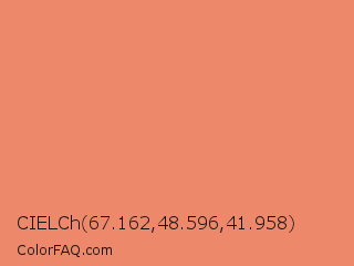 CIELCh 67.162,48.596,41.958 Color is a light red color and the nearest color is Middle Red #e58e73. Hex code #ee886b and RGB value is rgb(238,136,107). In RGB color space, this color is composed of 93% red, 53% green, 42% blue, In CMYK color space, this color is composed of 0% cyan, 43% magenta, 55% yellow , 7% black , In HSL color space, this color has a hue angle of 13° , 79% saturation and 68% lightness.