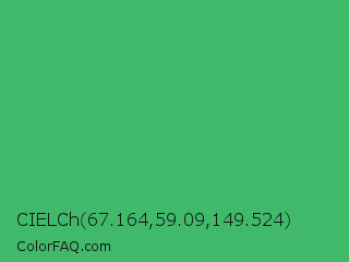 CIELCh 67.164,59.09,149.524 Color is a normal green color and the nearest color is Medium Sea Green #3cb371. Hex code #40b96b and RGB value is rgb(64,185,107). In RGB color space, this color is composed of 25% red, 73% green, 42% blue, In CMYK color space, this color is composed of 65% cyan, 0% magenta, 42% yellow , 27% black , In HSL color space, this color has a hue angle of 141° , 49% saturation and 49% lightness.