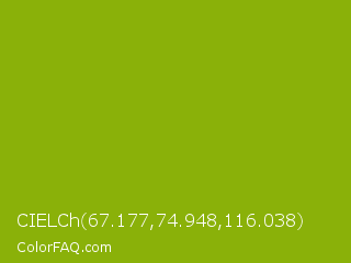 CIELCh 67.177,74.948,116.038 Color is a normal lime color and the nearest color is Apple Green #8db600. Hex code #8ab109 and RGB value is rgb(138,177,9). In RGB color space, this color is composed of 54% red, 69% green, 4% blue, In CMYK color space, this color is composed of 22% cyan, 0% magenta, 95% yellow , 31% black , In HSL color space, this color has a hue angle of 74° , 90% saturation and 36% lightness.