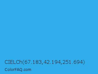 CIELCh 67.183,42.194,251.694 Color is a normal blue color and the nearest color is Button Blue #24a0ed. Hex code #2faeeb and RGB value is rgb(47,174,235). In RGB color space, this color is composed of 18% red, 68% green, 92% blue, In CMYK color space, this color is composed of 80% cyan, 26% magenta, 0% yellow , 8% black , In HSL color space, this color has a hue angle of 199° , 82% saturation and 55% lightness.
