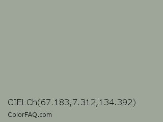 CIELCh 67.183,7.312,134.392 Color is a light green color and the nearest color is Delta #a4a49d. Hex code #9ea69a and RGB value is rgb(158,166,154). In RGB color space, this color is composed of 62% red, 65% green, 60% blue, In CMYK color space, this color is composed of 5% cyan, 0% magenta, 7% yellow , 35% black , In HSL color space, this color has a hue angle of 100° , 6% saturation and 63% lightness.