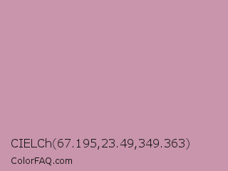 CIELCh 67.195,23.49,349.363 Color is a light rose color and the nearest color is Viola #cb8fa9. Hex code #c995ac and RGB value is rgb(201,149,172). In RGB color space, this color is composed of 79% red, 58% green, 67% blue, In CMYK color space, this color is composed of 0% cyan, 26% magenta, 14% yellow , 21% black , In HSL color space, this color has a hue angle of 333° , 33% saturation and 69% lightness.