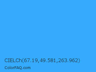 CIELCh 67.19,49.581,263.962 Color is a normal blue color and the nearest color is Brilliant Azure #3399ff. Hex code #34abfc and RGB value is rgb(52,171,252). In RGB color space, this color is composed of 20% red, 67% green, 99% blue, In CMYK color space, this color is composed of 79% cyan, 32% magenta, 0% yellow , 1% black , In HSL color space, this color has a hue angle of 204° , 97% saturation and 60% lightness.