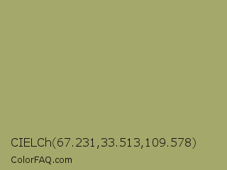 CIELCh 67.231,33.513,109.578 Color is a normal yellow color and the nearest color is Green Smoke #a4af6e. Hex code #a4a86a and RGB value is rgb(164,168,106). In RGB color space, this color is composed of 64% red, 66% green, 42% blue, In CMYK color space, this color is composed of 2% cyan, 0% magenta, 37% yellow , 34% black , In HSL color space, this color has a hue angle of 64° , 26% saturation and 54% lightness.