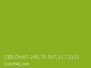 CIELCh 67.245,70.547,117.215 Color is a normal lime color and the nearest color is Citron #9fa91f. Hex code #8ab121 and RGB value is rgb(138,177,33). In RGB color space, this color is composed of 54% red, 69% green, 13% blue, In CMYK color space, this color is composed of 22% cyan, 0% magenta, 81% yellow , 31% black , In HSL color space, this color has a hue angle of 76° , 69% saturation and 41% lightness.