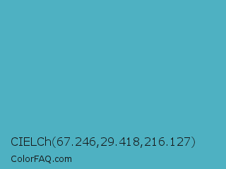 CIELCh 67.246,29.418,216.127 Color is a normal cyan color and the nearest color is Fountain Blue #56b4be. Hex code #4eb1c2 and RGB value is rgb(78,177,194). In RGB color space, this color is composed of 31% red, 69% green, 76% blue, In CMYK color space, this color is composed of 60% cyan, 9% magenta, 0% yellow , 24% black , In HSL color space, this color has a hue angle of 189° , 49% saturation and 53% lightness.