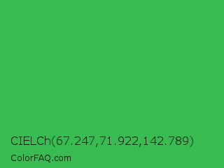 CIELCh 67.247,71.922,142.789 Color is a normal green color and the nearest color is Chateau Green #40a860. Hex code #38bb50 and RGB value is rgb(56,187,80). In RGB color space, this color is composed of 22% red, 73% green, 31% blue, In CMYK color space, this color is composed of 70% cyan, 0% magenta, 57% yellow , 27% black , In HSL color space, this color has a hue angle of 131° , 54% saturation and 48% lightness.