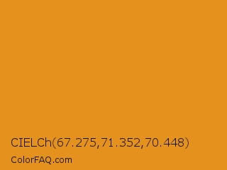 CIELCh 67.275,71.352,70.448 Color is a normal orange color and the nearest color is Dixie #e29418. Hex code #e5911d and RGB value is rgb(229,145,29). In RGB color space, this color is composed of 90% red, 57% green, 11% blue, In CMYK color space, this color is composed of 0% cyan, 37% magenta, 87% yellow , 10% black , In HSL color space, this color has a hue angle of 35° , 79% saturation and 51% lightness.