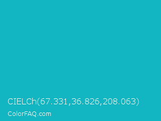 CIELCh 67.331,36.826,208.063 Color is a normal cyan color and the nearest color is Tiffany Blue #0abab5. Hex code #12b5c2 and RGB value is rgb(18,181,194). In RGB color space, this color is composed of 7% red, 71% green, 76% blue, In CMYK color space, this color is composed of 91% cyan, 7% magenta, 0% yellow , 24% black , In HSL color space, this color has a hue angle of 184° , 83% saturation and 42% lightness.