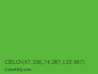 CIELCh 67.336,74.287,133.967 Color is a normal green color and the nearest color is Green RYB #66b032. Hex code #58b93a and RGB value is rgb(88,185,58). In RGB color space, this color is composed of 35% red, 73% green, 23% blue, In CMYK color space, this color is composed of 52% cyan, 0% magenta, 69% yellow , 27% black , In HSL color space, this color has a hue angle of 106° , 52% saturation and 48% lightness.