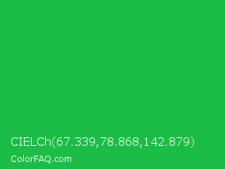 CIELCh 67.339,78.868,142.879 Color is a normal green color and the nearest color is Dark Pastel Green #03c03c. Hex code #1bbd47 and RGB value is rgb(27,189,71). In RGB color space, this color is composed of 11% red, 74% green, 28% blue, In CMYK color space, this color is composed of 86% cyan, 0% magenta, 62% yellow , 26% black , In HSL color space, this color has a hue angle of 136° , 75% saturation and 42% lightness.
