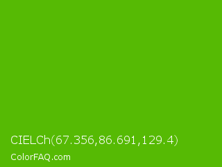 CIELCh 67.356,86.691,129.4 Color is a normal green color and the nearest color is Kelly Green #4cbb17. Hex code #56ba04 and RGB value is rgb(86,186,4). In RGB color space, this color is composed of 34% red, 73% green, 2% blue, In CMYK color space, this color is composed of 54% cyan, 0% magenta, 98% yellow , 27% black , In HSL color space, this color has a hue angle of 93° , 96% saturation and 37% lightness.