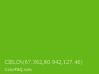 CIELCh 67.362,80.942,127.46 Color is a normal green color and the nearest color is Lima #76bd17. Hex code #65b818 and RGB value is rgb(101,184,24). In RGB color space, this color is composed of 40% red, 72% green, 9% blue, In CMYK color space, this color is composed of 45% cyan, 0% magenta, 87% yellow , 28% black , In HSL color space, this color has a hue angle of 91° , 77% saturation and 41% lightness.