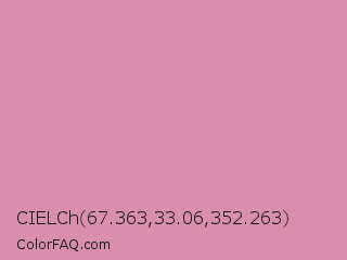 CIELCh 67.363,33.06,352.263 Color is a light rose color and the nearest color is Can Can #d591a4. Hex code #d98ead and RGB value is rgb(217,142,173). In RGB color space, this color is composed of 85% red, 56% green, 68% blue, In CMYK color space, this color is composed of 0% cyan, 35% magenta, 20% yellow , 15% black , In HSL color space, this color has a hue angle of 335° , 50% saturation and 70% lightness.