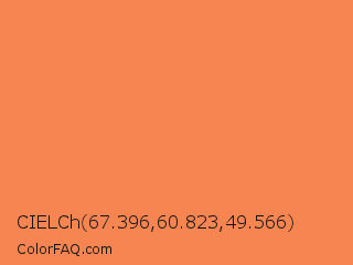 CIELCh 67.396,60.823,49.566 Color is a light orange color and the nearest color is Coral #ff7f50. Hex code #f78552 and RGB value is rgb(247,133,82). In RGB color space, this color is composed of 97% red, 52% green, 32% blue, In CMYK color space, this color is composed of 0% cyan, 46% magenta, 67% yellow , 3% black , In HSL color space, this color has a hue angle of 19° , 91% saturation and 65% lightness.