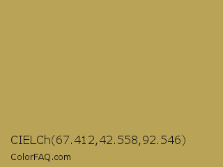 CIELCh 67.412,42.558,92.546 Color is a normal yellow color and the nearest color is Husk #b7a458. Hex code #b9a356 and RGB value is rgb(185,163,86). In RGB color space, this color is composed of 73% red, 64% green, 34% blue, In CMYK color space, this color is composed of 0% cyan, 12% magenta, 54% yellow , 27% black , In HSL color space, this color has a hue angle of 47° , 41% saturation and 53% lightness.