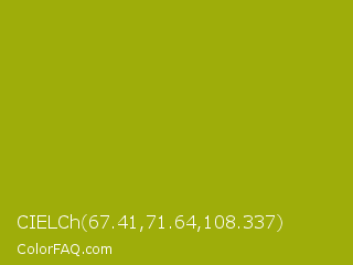 CIELCh 67.41,71.64,108.337 Color is a normal yellow color and the nearest color is Pistachio Green #9dc209. Hex code #9ead0a and RGB value is rgb(158,173,10). In RGB color space, this color is composed of 62% red, 68% green, 4% blue, In CMYK color space, this color is composed of 9% cyan, 0% magenta, 94% yellow , 32% black , In HSL color space, this color has a hue angle of 66° , 89% saturation and 36% lightness.