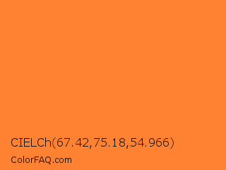 CIELCh 67.42,75.18,54.966 Color is a normal orange color and the nearest color is Crusta #fd7b33. Hex code #ff8132 and RGB value is rgb(255,129,50). In RGB color space, this color is composed of 100% red, 51% green, 20% blue, In CMYK color space, this color is composed of 0% cyan, 49% magenta, 80% yellow , 0% black , In HSL color space, this color has a hue angle of 23° , 100% saturation and 60% lightness.