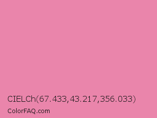 CIELCh 67.433,43.217,356.033 Color is a light rose color and the nearest color is Carissma #ea88a8. Hex code #ea85ab and RGB value is rgb(234,133,171). In RGB color space, this color is composed of 92% red, 52% green, 67% blue, In CMYK color space, this color is composed of 0% cyan, 43% magenta, 27% yellow , 8% black , In HSL color space, this color has a hue angle of 337° , 71% saturation and 72% lightness.