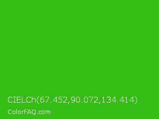 CIELCh 67.452,90.072,134.414 Color is a normal green color and the nearest color is Harlequin Green #46cb18. Hex code #36bd15 and RGB value is rgb(54,189,21). In RGB color space, this color is composed of 21% red, 74% green, 8% blue, In CMYK color space, this color is composed of 71% cyan, 0% magenta, 89% yellow , 26% black , In HSL color space, this color has a hue angle of 108° , 80% saturation and 41% lightness.