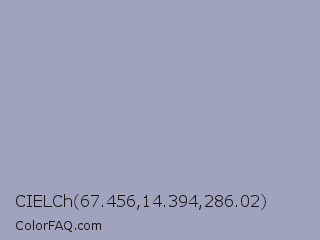 CIELCh 67.456,14.394,286.02 Color is a light blue color and the nearest color is Gull Gray #9dacb7. Hex code #9fa3bd and RGB value is rgb(159,163,189). In RGB color space, this color is composed of 62% red, 64% green, 74% blue, In CMYK color space, this color is composed of 16% cyan, 14% magenta, 0% yellow , 26% black , In HSL color space, this color has a hue angle of 232° , 19% saturation and 68% lightness.