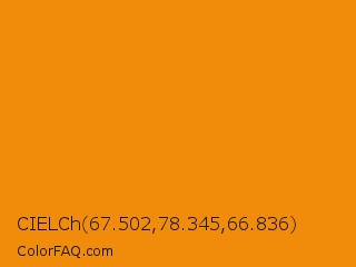 CIELCh 67.502,78.345,66.836 Color is a normal orange color and the nearest color is Tangerine #f28500. Hex code #f08c09 and RGB value is rgb(240,140,9). In RGB color space, this color is composed of 94% red, 55% green, 4% blue, In CMYK color space, this color is composed of 0% cyan, 42% magenta, 96% yellow , 6% black , In HSL color space, this color has a hue angle of 34° , 93% saturation and 49% lightness.
