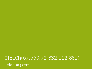 CIELCh 67.569,72.332,112.881 Color is a normal lime color and the nearest color is Citron #9fa91f. Hex code #94b012 and RGB value is rgb(148,176,18). In RGB color space, this color is composed of 58% red, 69% green, 7% blue, In CMYK color space, this color is composed of 16% cyan, 0% magenta, 90% yellow , 31% black , In HSL color space, this color has a hue angle of 71° , 81% saturation and 38% lightness.