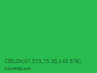 CIELCh 67.573,75.35,143.578 Color is a normal green color and the nearest color is Wageningen Green #34b233. Hex code #28bd4e and RGB value is rgb(40,189,78). In RGB color space, this color is composed of 16% red, 74% green, 31% blue, In CMYK color space, this color is composed of 79% cyan, 0% magenta, 59% yellow , 26% black , In HSL color space, this color has a hue angle of 135° , 65% saturation and 45% lightness.