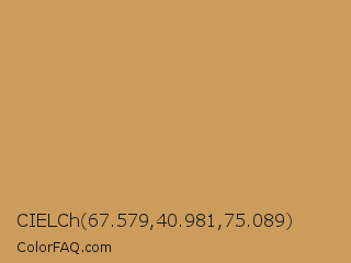 CIELCh 67.579,40.981,75.089 Color is a normal orange color and the nearest color is Brown Yellow #cc9966. Hex code #cc9c5d and RGB value is rgb(204,156,93). In RGB color space, this color is composed of 80% red, 61% green, 36% blue, In CMYK color space, this color is composed of 0% cyan, 24% magenta, 54% yellow , 20% black , In HSL color space, this color has a hue angle of 34° , 52% saturation and 58% lightness.
