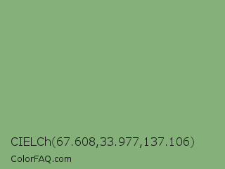 CIELCh 67.608,33.977,137.106 Color is a normal green color and the nearest color is Asparagus #87a96b. Hex code #85b07a and RGB value is rgb(133,176,122). In RGB color space, this color is composed of 52% red, 69% green, 48% blue, In CMYK color space, this color is composed of 24% cyan, 0% magenta, 31% yellow , 31% black , In HSL color space, this color has a hue angle of 108° , 25% saturation and 58% lightness.