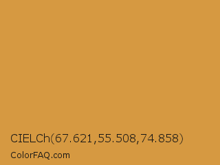 CIELCh 67.621,55.508,74.858 Color is a normal orange color and the nearest color is Tigers Eye #e08d3c. Hex code #d69941 and RGB value is rgb(214,153,65). In RGB color space, this color is composed of 84% red, 60% green, 25% blue, In CMYK color space, this color is composed of 0% cyan, 29% magenta, 70% yellow , 16% black , In HSL color space, this color has a hue angle of 35° , 65% saturation and 55% lightness.