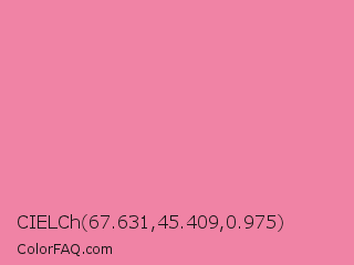 CIELCh 67.631,45.409,0.975 Color is a light rose color and the nearest color is Carissma #ea88a8. Hex code #f083a5 and RGB value is rgb(240,131,165). In RGB color space, this color is composed of 94% red, 51% green, 65% blue, In CMYK color space, this color is composed of 0% cyan, 45% magenta, 31% yellow , 6% black , In HSL color space, this color has a hue angle of 341° , 78% saturation and 73% lightness.