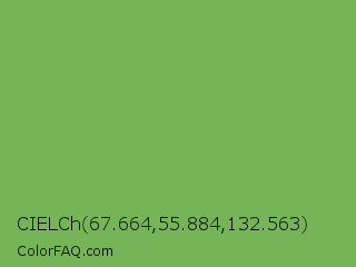 CIELCh 67.664,55.884,132.563 Color is a normal green color and the nearest color is Bud Green #7bb661. Hex code #75b557 and RGB value is rgb(117,181,87). In RGB color space, this color is composed of 46% red, 71% green, 34% blue, In CMYK color space, this color is composed of 35% cyan, 0% magenta, 52% yellow , 29% black , In HSL color space, this color has a hue angle of 101° , 39% saturation and 53% lightness.
