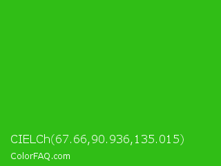 CIELCh 67.66,90.936,135.015 Color is a normal green color and the nearest color is Harlequin Green #46cb18. Hex code #30be16 and RGB value is rgb(48,190,22). In RGB color space, this color is composed of 19% red, 75% green, 9% blue, In CMYK color space, this color is composed of 75% cyan, 0% magenta, 88% yellow , 25% black , In HSL color space, this color has a hue angle of 111° , 79% saturation and 42% lightness.